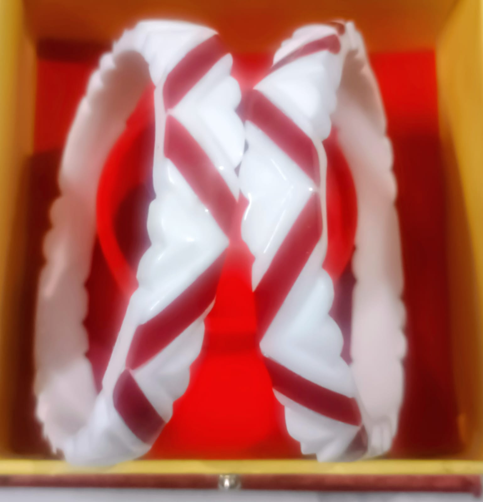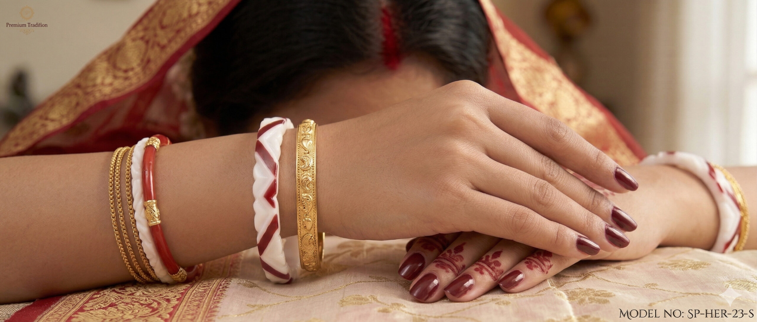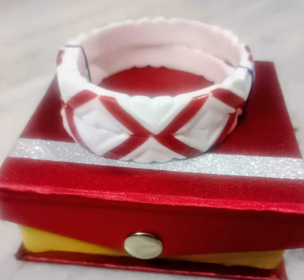 Experience the perfect blend of ritual and style with our premium quality 2-in-1 Shakha Pola, a masterpiece designed to honour Bengali tradition through a modern lens. This innovative ornament features a seamless Pola paste over original shell Shakha, integrating the sacred white and vibrant red elements into a single, elegant band. The design stands out with its meticulous hand-carved zigzag pattern and deep crimson diagonal inlays, offering a textured, contemporary aesthetic that maintains the auspiciousness of the classic duo. Crafted for durability and a smooth, skin-friendly finish, this designer piece is the ultimate choice for the modern married woman who values both cultural heritage and effortless sophistication.